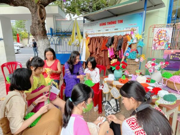 Hình. Thành viên Câu lạc bộ hỗ trợ hướng dẫn trẻ em gái đan len tại hoạt động “Phiên chợ Yêu thương”